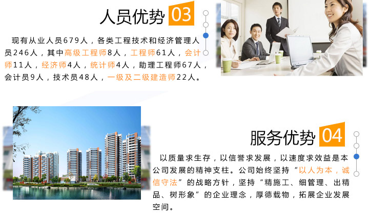 質量求生存,以信譽求發展,以速度求效益是本公司發展的精神支柱。公司始終堅持“以人為本,誠信守法”的戰略方針,堅持“精施工、細管理、出精品、樹形象”的企業理念,厚德載物,拓展企業發展空間。